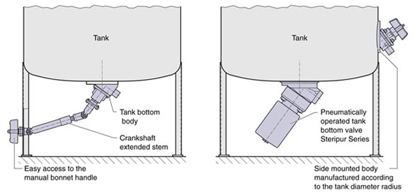 For all options the welded valve is rotated into the self draining position and extended to eliminate interference with the tank bottom